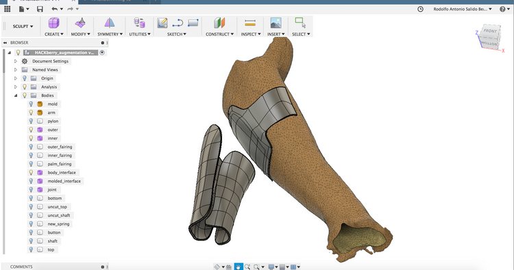 The 3D scan was imported into Autodesk Fusion 360 to serve as a mold for the organic design of cosmetic fairings and the forearm mount. In the sculpting environment of Fusion 360, T-Spline planes were created for each component. The Pull feature was used to align the vertices of the planes with those of the imported mesh. Faces and vertices of the T-Spline planes were then modified to achieve a satisfactory cosmetic product with high geometric fidelity to the biological limb. An adjustable elbow was sculpted using a Quadball T-Spline shape.The following videos can serve as a guide to the aforementioned processes: Modeling for the human body in fusion 360 and Mesh modeling.